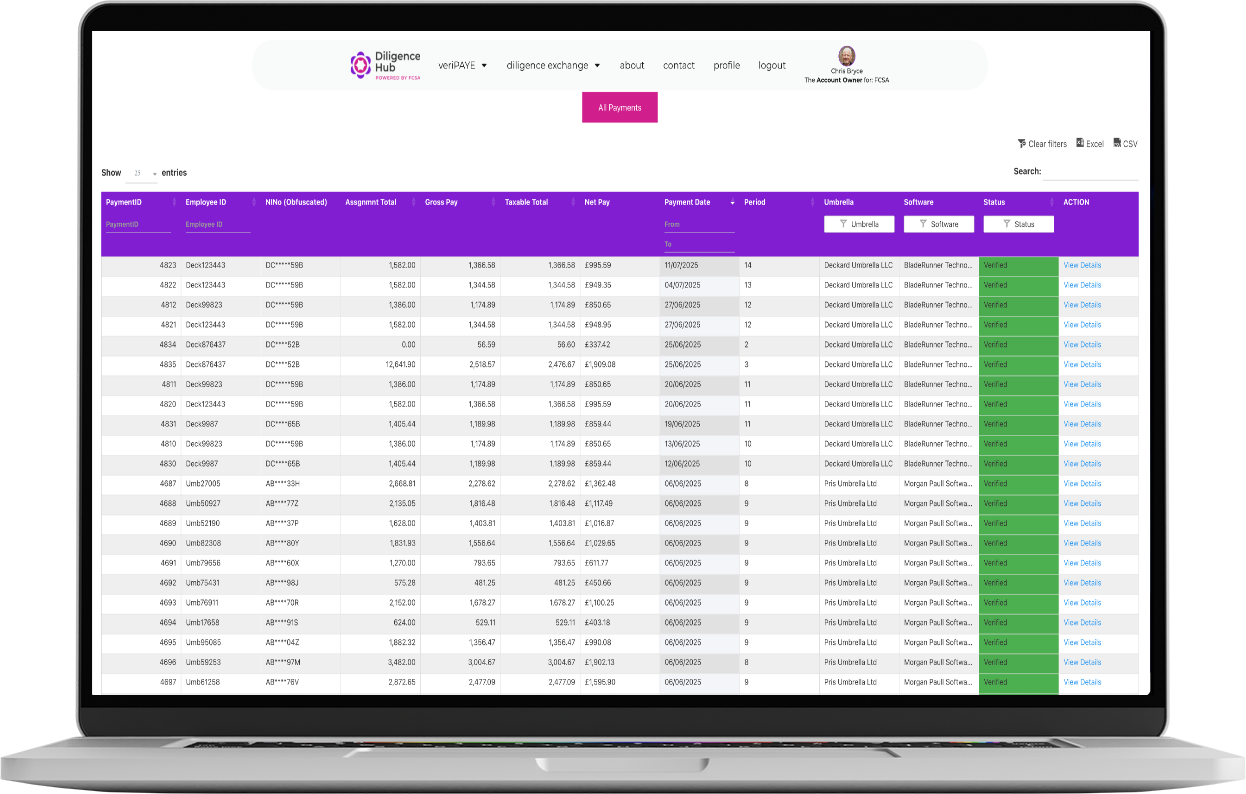 Diligence Hub reduces the administrative burden of compliance by bringing payroll verification and due diligence into one platform. By automating checks that would otherwise require hours of manual effort, it gives agencies, umbrellas, and end-clients a faster way to prove compliance.