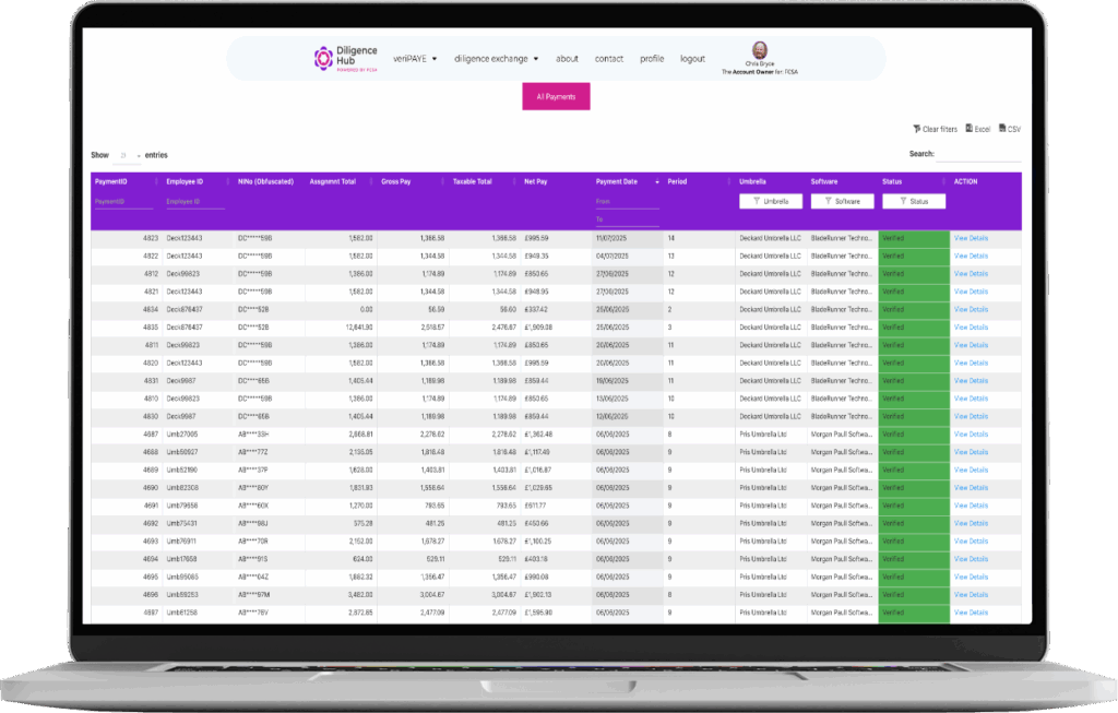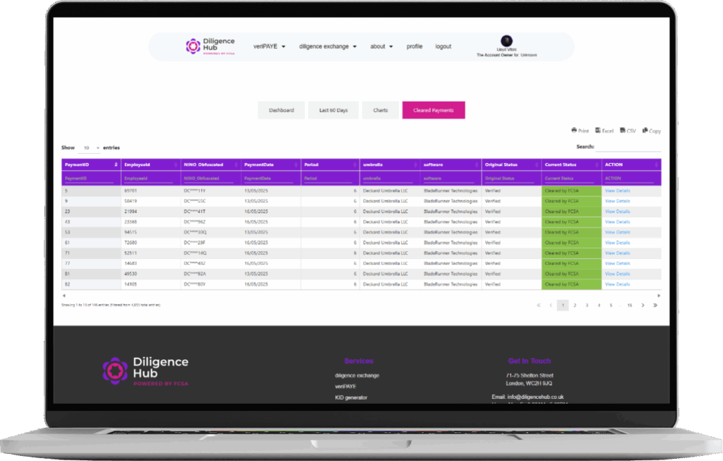Diligence Hub reduces the administrative burden of compliance by bringing payroll verification and due diligence into one platform. By automating checks that would otherwise require hours of manual effort, it gives agencies, umbrellas, and end-clients a faster way to prove compliance.